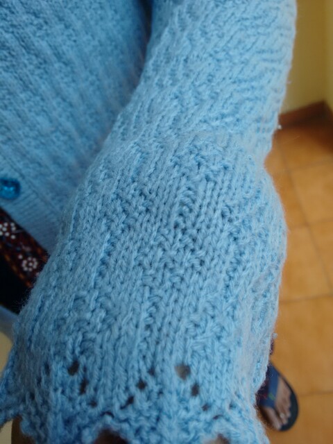 हलके नीले रंग की ऊन से ट्वीन सेट का बिना बाहों का गोल गले का हाफ स्वेटर बना है और फुलस्वेटर की बटन पट्टी व बौर्डर कंगूरेदार बनाई गयी है|अन्दर की सेल्फ डिजाइन दोनों स्वेटरों की एक ही है|